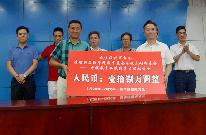 仪式上,民进绍兴市委会与我校签订捐赠协议。唐和祥代表学校接受捐赠并向民进绍兴市委会颁发捐赠证书。