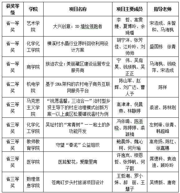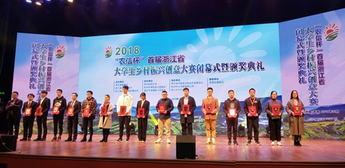创意,让乡村更美好!11月23—25日,“农信杯”浙江省首届大学生乡村振兴创意大赛(学科竞赛A类)在苍南举行。此次活动由浙江省教育厅、浙江省农业厅、浙江省农村信用社联合社主办。经过角逐,我校获金奖3项(该类别全省金奖仅16项),银奖1项,铜奖5项,学校获优秀组织奖。