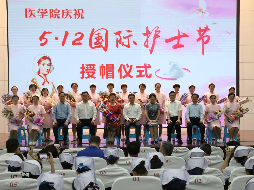 5月11日晚,“5•12”国际护士节授帽仪式暨“鉴湖学者”讲座教授聘任仪式在铁城科教馆报告厅举行。校党委书记汪俊昌,校党委副书记郝敬习,副校长柳国庆,福建医科大学护理学院原院长、博士生导师、第43届南丁格尔奖章获得者姜小鹰教授,医学院各科室(系部、中心)负责人、护理系全体教师及护理学专业2016级全体同学参加了活动。