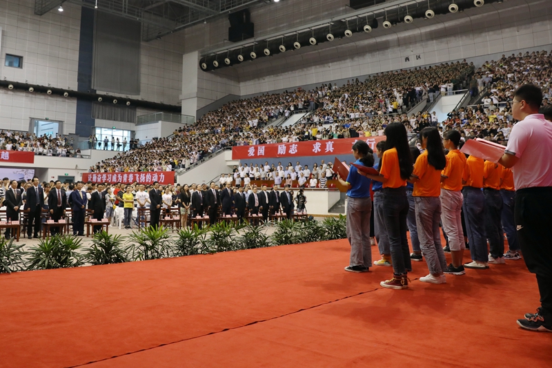 典礼在庄严的国歌声中拉开序幕。校长王建力致辞,向3716名2019级新生表示热烈的欢迎。