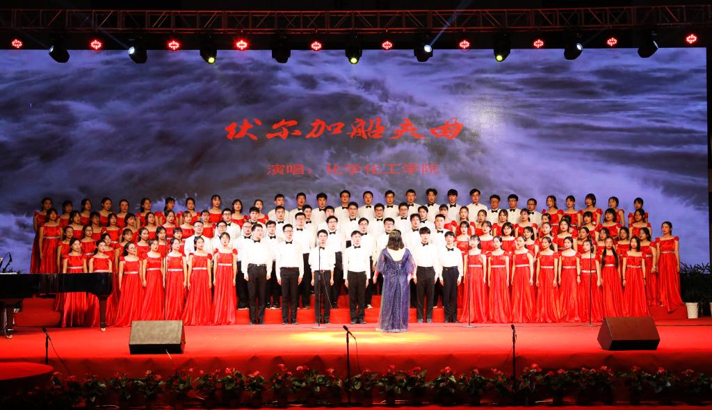 化学化工学院自信开唱《伏尔加船夫曲》,在音乐的河流中缓缓流淌,那铿锵有力的号子,从历史的深处蔓延到现实的舞台。纺织服装学院参赛选手身着学院师生党员自主设计、制作完成,白色绸缎制成的包含我校logo的中式服饰,唱起《歌唱祖国》,诉说着学子们对祖国、对学校的深深祝福。