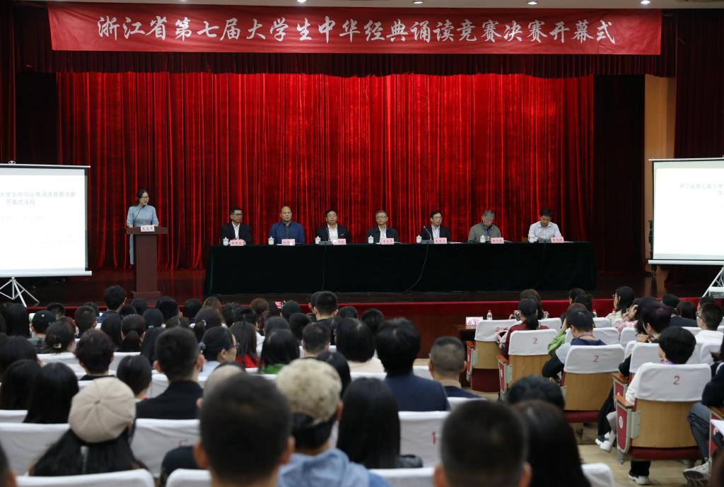 10月19-20日,浙江省第七届大学生中华经典诵读竞赛决赛在我校举行。本次大赛由浙江省语言文字工作委员会、浙江省大学生科技竞赛委员会主办,我校承办。浙江省语言文字工作者协会会长王建华,浙江省语委办主任、浙江省教育厅语管处处长朱鸿飞,绍兴市语委办主任孙国范,我校副校长柳国庆和教务处、教师教育学院负责人等出席开幕式。