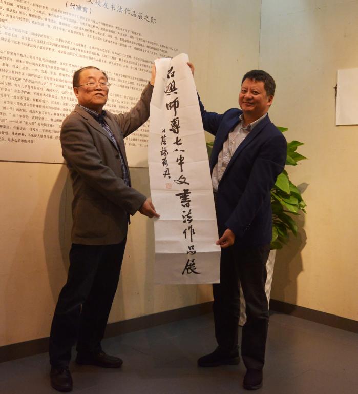 沈赤代表85届校友赵雁君向本次书法作品展赠送题词,许学刚代表78中文校友接受题赠。