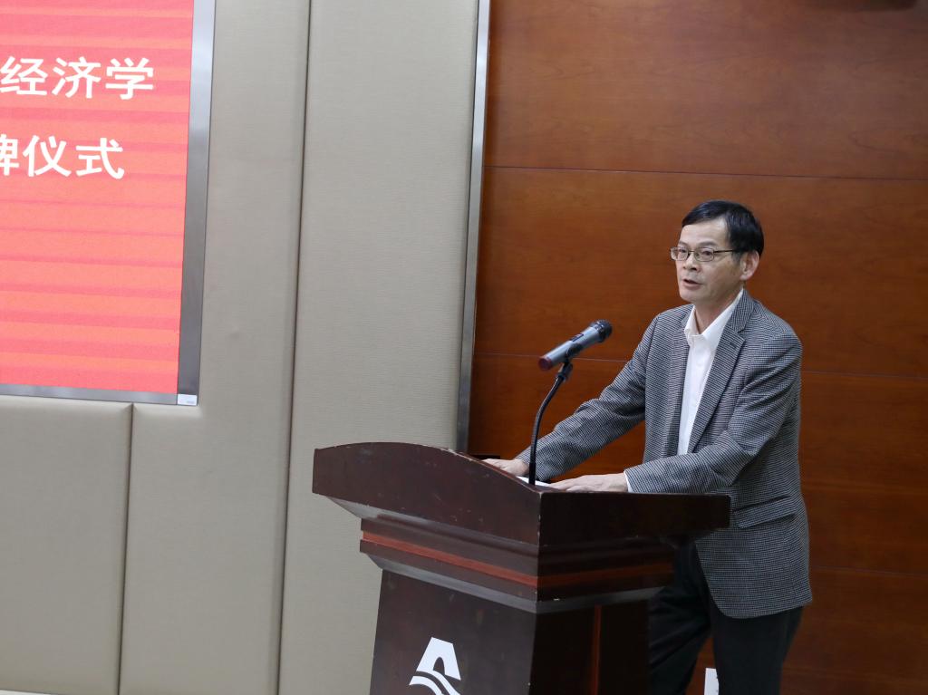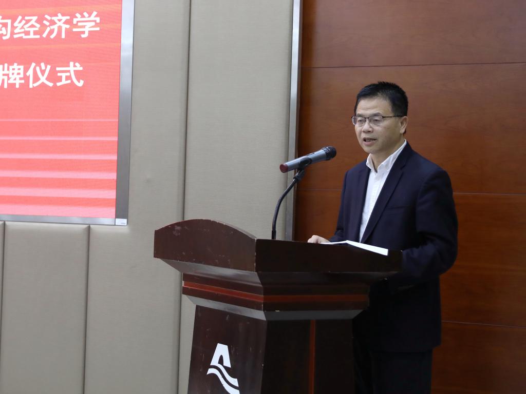 人文社科处处长王华锋主持授牌仪式。我校“新结构经济学长三角研究中心”负责人、商学院院长周鸿勇教授在会上作表态发言。