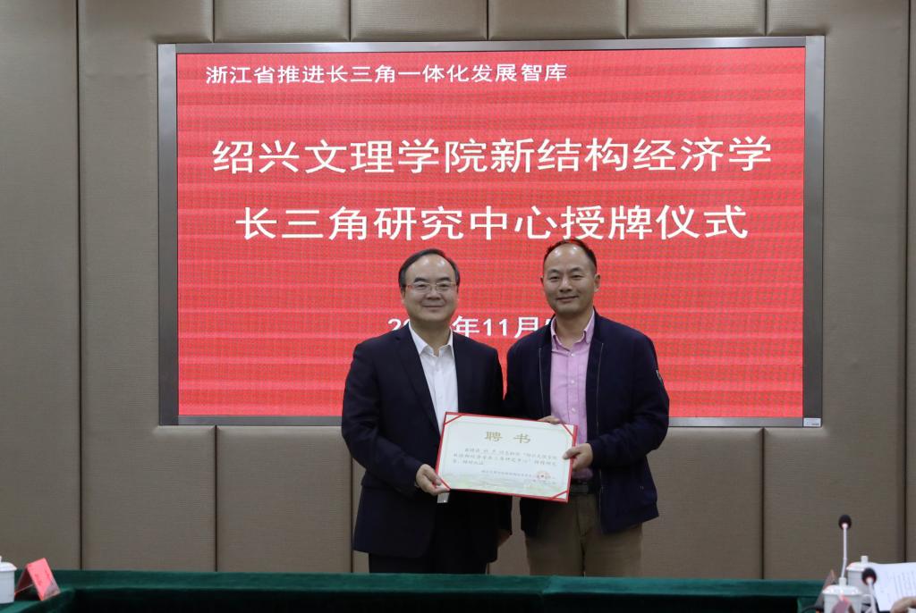 马德富向学校授牌“浙江省推进长三角一体化发展智库支持单位——新结构经济学长三角研究中心”,寿永明代表学校接牌。黄坚为“新结构经济学长三角研究中心”特聘研究员杜平、陈扬、顾利民颁发聘书。