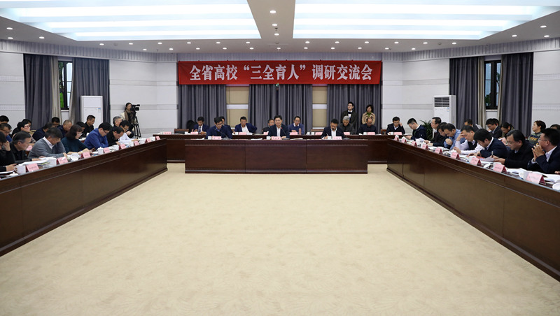 干武东在讲话中指出,全省高校深入贯彻中央和省委的部署要求,落实立德树人根本任务,坚定政治方向,加强组织领导,加大落实力度,高校思政工作在改进中强化、在创新中发展,取得了一些新进展、新成效。我省被教育部确定为全国首批“三全育人”综合改革试点省份。新华社《国内动态清样》专题刊登我省高校思政课建设情况,中央领导作出重要批示,中央电视台、《人民日报》《光明日报》等中央媒体多次报道我省高校思政课改革创新举措。概括起来,主要体现在“四个更加”,一是思想铸魂更加聚焦聚力,二是育人工作更加深入深化,三是队伍建设更加有力有效,四是维稳责任更加落地落实。就深入推进我省高校“三全育人”综合改革,干武东提出四点要求:一是高举理论旗帜,推动专业教师与思政教师齐心协力,构建全员育人工作格局;二是高扬时代旋律,推动校园生活与管理服务齐头并进,构建全程育人工作格局;三是高度整合资源,推动校内校外与网上网下齐抓共管,构建全方位育人工作格局;四是高效落实责任,推动“三全育人”综合改革任务落地见效,全面提升我省高校思政工作水平。