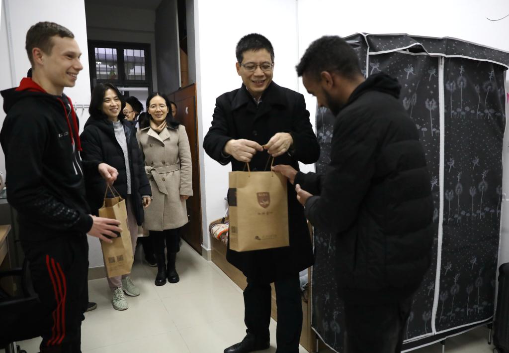 1月22日,农历腊月廿八,校长王建力走进公寓和书院,向在校过年的国内外学生送上新春祝福,共迎庚子年的到来。党办校办、学工部、研究生工作部、国际教育学院等部门负责人陪同慰问。