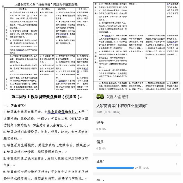 5、“管”指的是“学生管理”。线上教学最难的就是学生的管理,我们无法把控学生是否在互联网的另一端进行着课程的学习。三位老师通过签名签到、过程把控和随机连线三种方式最大程度掌控了学生的学习情况。过程把控一是指利用钉钉平台发起全班视频会议,学生的学习状态一目了然;二是可以发布课堂内的定时作业以检测学生是否在做作业。随机连线是指通过视频连线把同学请入课堂的方式检验学生是否真正在课堂学习。