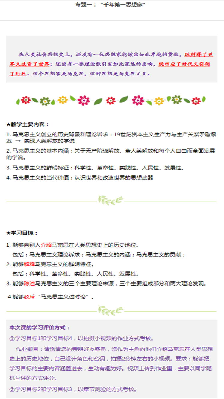 目前思政课的网络教学已经有很多慕课,但是慕课的学习会使本课程的学习停留在知识层面,一方面难以吸引现在的学生,另一方面也很难使学生化理论为智慧、化理论为德性、化理论为方法,获得能力的提升。基于这一考虑,本课程没有引入慕课的学习,而是根据学生思想与能力发展的实际需要,结合教学内容设计比较接地气的教学目标、教学活动和评价方式。