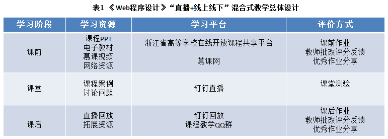《Web程序设计》“直播+线上线下”混合式教学总体设计如表1所示。