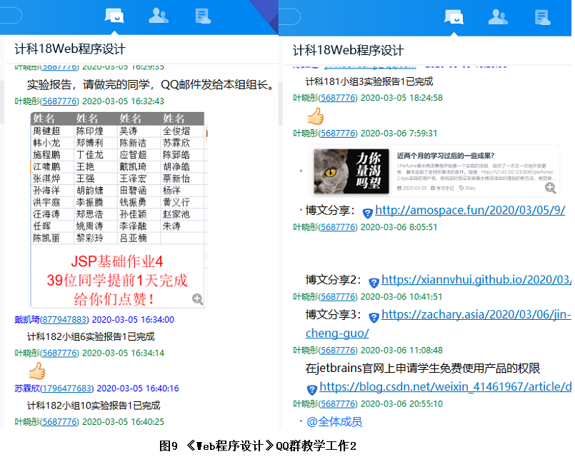 因为是网络教学,做好学生课后学习的引导与督促,也是十分重要的教学环节。本课程对班级学生进行了分组,每组4位学生,由一名学习能力和态度较好的学生担任组长,小组长统计作业任务的完成情况,本组全部完成后在QQ群发信息。通过这种QQ群消息的模式,侧面督促学生作业进度。教师在省教学平台查看作业上交情况,一般在作业截止前一天,在QQ群发消息,点名表扬这些学习积极的学生,从而激励学生们的学习热情。