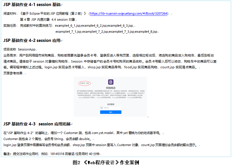 一般上课前三天,在省教学平台上布置作业任务,同时在课程QQ教学群里发布信息。预习作业规定了具体的阅读和练习要求。阅读包括教材电子版相应章节内容,练习包括教材案例练习、基础案例练习和拓展案例练习。所有学生都可以顺利完成阅读和教材案例练习;基础案例练习是在教材案例的基础上做适当的变形和综合,大部分学生可以完成;拓展案例练习有一定难度,小部分学生可以完成。通过课前的预习作业,引导和督促学生对教学基础知识进行自主学习,为课堂直播教学做好准备。图2为本课程一次作业展示。