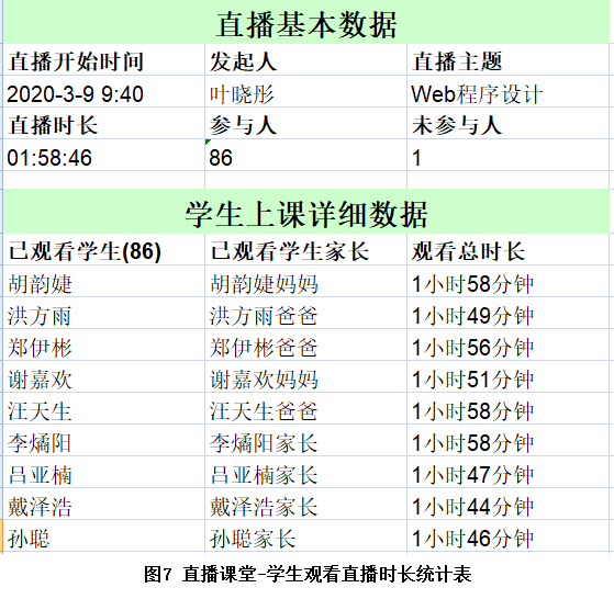 课前10分钟,开始钉钉直播,播放音乐,开启课前签到。上课时间到,先试音,确保学生听清楚后再按照预先打印好的直播备课单开始直播。本课程主要在Web开发工具中进行操作演示和代码分析。直播过程中的提问和讨论采用钉钉直播群里文字形式,一般简单问题用选择题,让学生发1,2,3,4形式的答案选项,这种形式参与度高,效率高。直播结束,导出学生签到表和直播听课时长表。