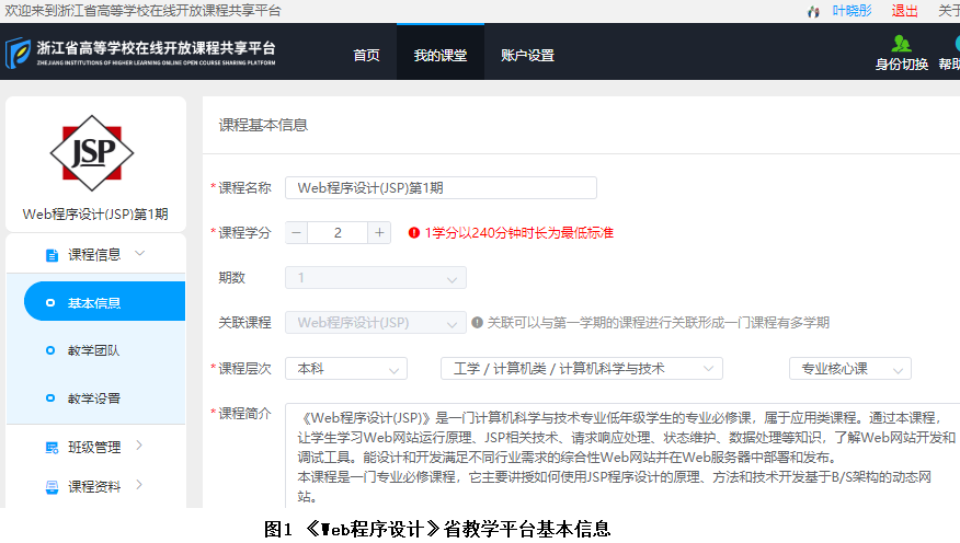 课程主讲教师近几年一直使用学校Elearning网络教学平台,寒假里注册开通了省教学平台,开学前初步完成教学资源的建设,后期将继续更新教学资源。图1为省教学平台上本课程基本信息。