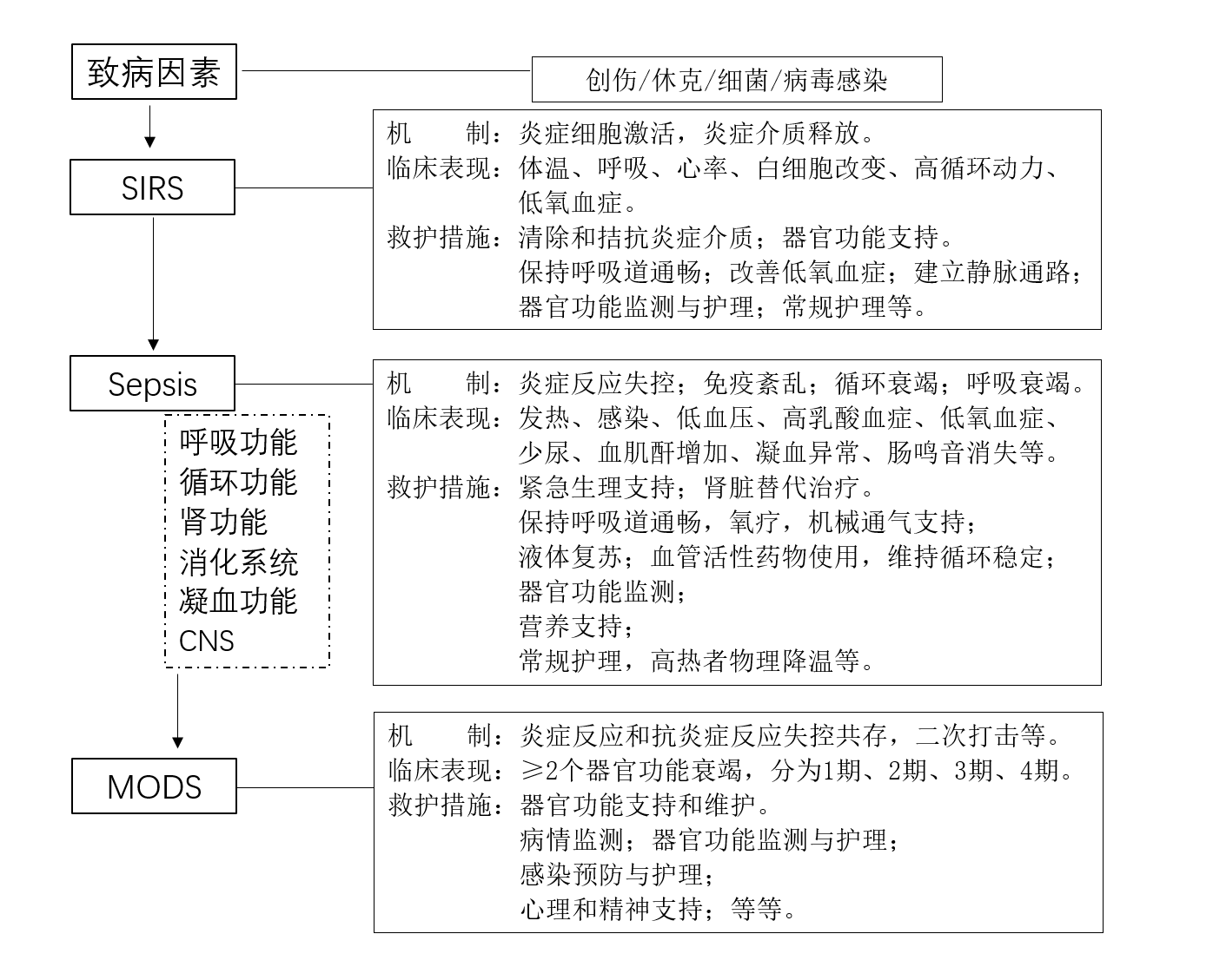 备注:全身炎症反应综合征(systemic inflammatory response syndrome,SIRS);脓毒症(Sepsis);多器官功能障碍综合征(Multiple organ dysfunction syndrome, MODS)。