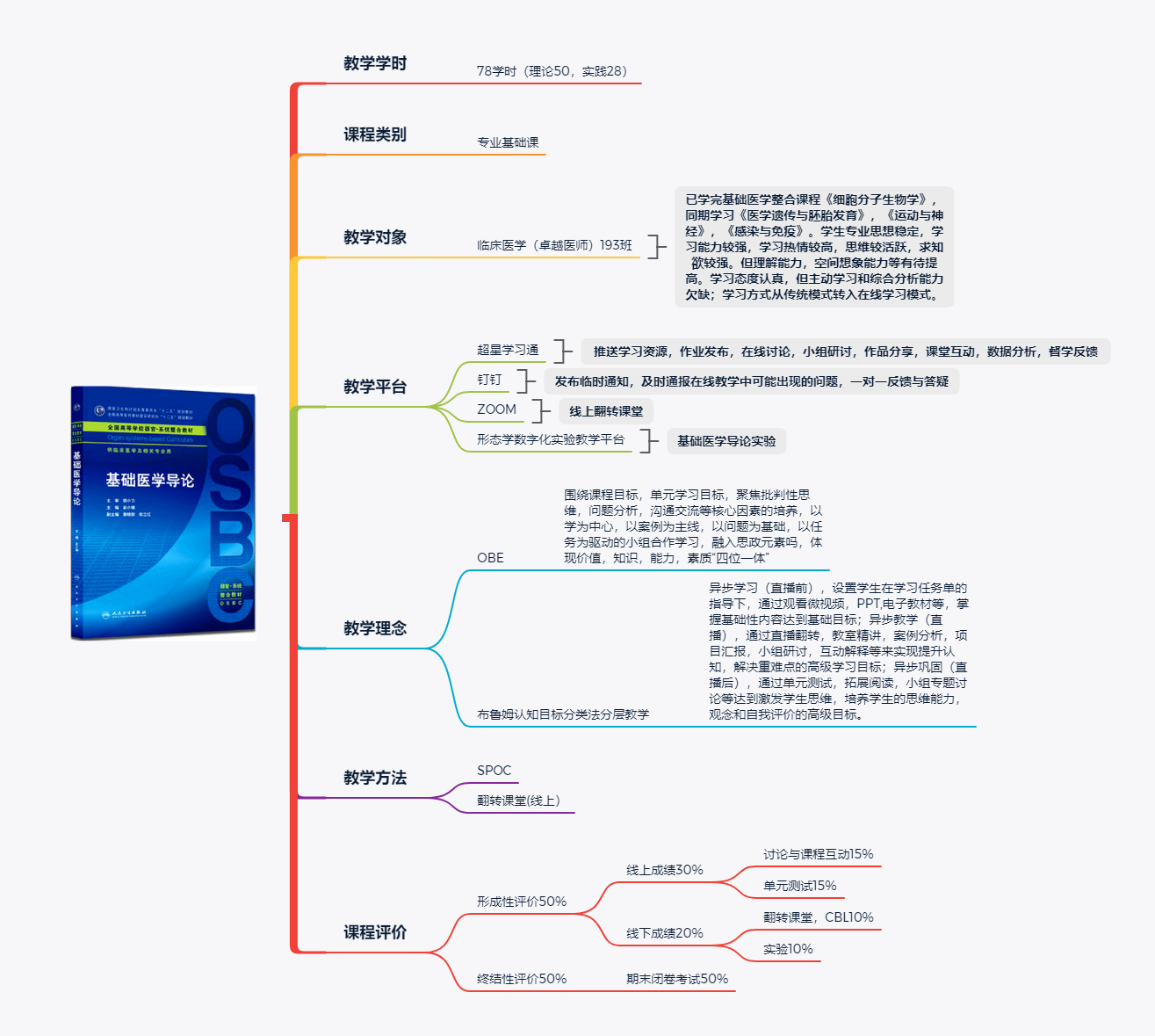 开课准备:《基础医学导论》于2017年2月在超星泛雅平台上线,已完成1个周期的线上线下混合式教学实践。本人结合多年积累的线上线下综合式教学经验,结合疫情,在原有的基础上,经过前期调研,优化了在线课程体系,细化了学习任务和知识结构,完善了教学资源,按知识点拆分录制微课和上传电子教材,并充实了试题库等。