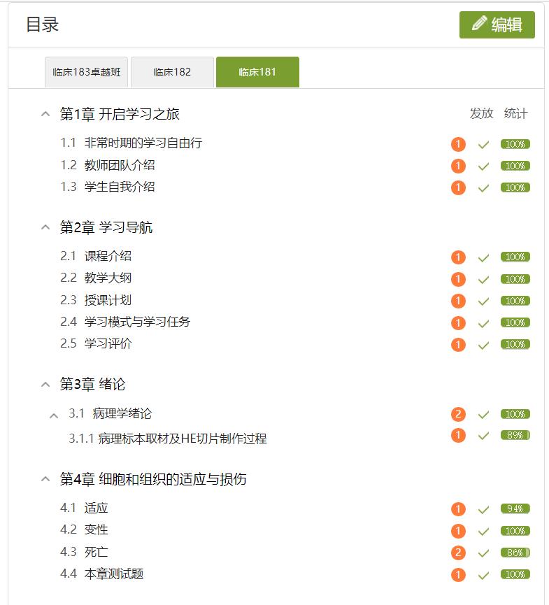 1.学习通教学平台建设。在正式开展线上学习前,课程组老师先在中国大学慕课、人卫慕课、学堂在线等优质慕课平台挑选病理学优秀教学资源,最终选定华中科技大学王国平教授主讲的病理学课程,并将契合我校的临床医学专业学生的前四周的教学视频进行录制并上传学习通,方便学生开展自主学习及在线学习情况统计。建设课程习题库,方便线上教学时开展课堂测验及章节测验,对学生学习效果进行检验。并在资料区上传教学课件、电子教材、校外拓展学习资源等。