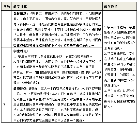 护理研究采用以学为中心的教学理念,以一致性建构为课程设计基本原则,从有意义学习分类法6个维度(核心知识、学以致用、触类旁通、人性维度、价值情怀和学会学习)制定学习目标,学习活动和学习测评。课程共9次课,采用线上线下混合式教学模式,以面授为基础(疫情期间采用直播方式),以学习通(超星泛雅)课程平台为线上依托,借鉴中国大学mooc平台中相关课程,以护理研究基本过程为理论学习主线,以一个小组任务(项目设计:撰写一份护理研究计划书)及其衍生的个人作业和小组作业为知识技能运用主线,以测验、讨论、知识分享、个人反思活动等为辅助,完成围绕护理研究计划书撰写(其内容组成部分实质是护理研究基本过程)的“边学边用”、螺旋式学习。