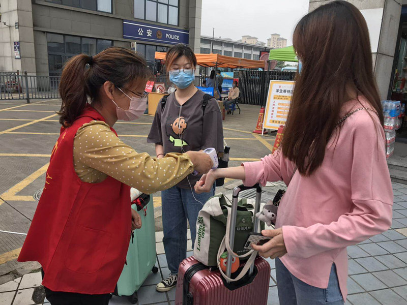 学校实行人流错时错峰抵校和校门口交通协调,自驾车辆即停即行,学生下车后立即进入专有通道。经过身份核实、两次体温检测、手部清洁消毒、更换口罩核验等程序,学生即可入校。进入校区后,工作人员和志愿者们帮助学生搬运行李,核验登记后进入宿舍。