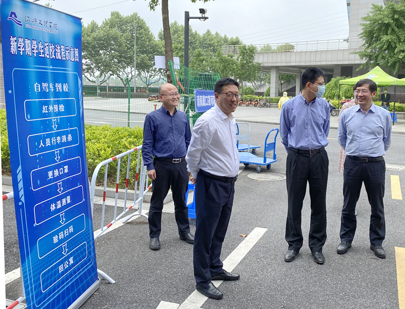 5月5日-6日,我校迎来了2020年春季学期错峰开学的第一批返校学生。校党委书记汪俊昌、校长王建力,校党委副书记沈赤、郝敬习,副校长柳国庆,纪委书记柯羽,副校长黄坚,校党委委员、组织部部长宣绍龙等来到现场,亲切看望了返校复学的教师、同学以及现场工作人员和志愿者。