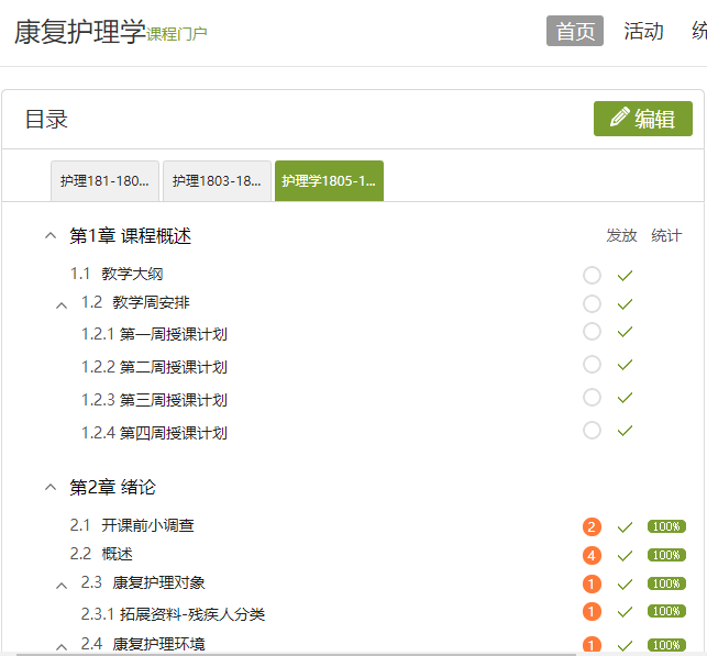 2.超星学习通资源平台建设。基于超星学习通中强大的资源库,我们查找到了很多与康复相关的课程,如《康复评定学》、《康复护理学》、《康复治疗技术》、《运动康复》等等,但是没有一门课程可以供我们直接借鉴使用,因此我们自主构建课程的框架和内容,提前公布课程的大纲、授课计划,提出相关学习要求。每个章节都包含电子版的教材截图、教学课件、教学文档、教学速课、课堂测试、拓展材料等,并引用超星学习通中优秀课程的教学视频、操作示范、知识链接作为重要的补充。