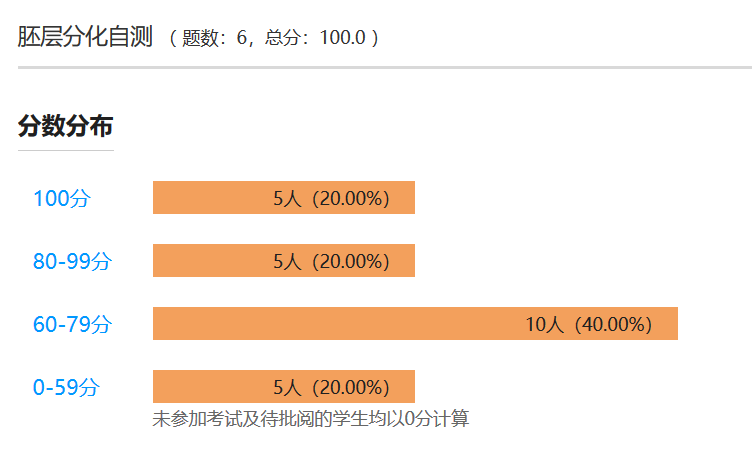 课堂开展同步的交互式学习:首先对课前的自测情况做简要点评(图10);其次对布置的课后主观题作业(人类成功受孕的条件)进行学生互评,该作业基于教材中的“插入框”“子宫内膜容受性”延伸,每人将评价3位学生的作业,经充分的讨论,与学生形成基本一致的意见。以上在30min内完成。