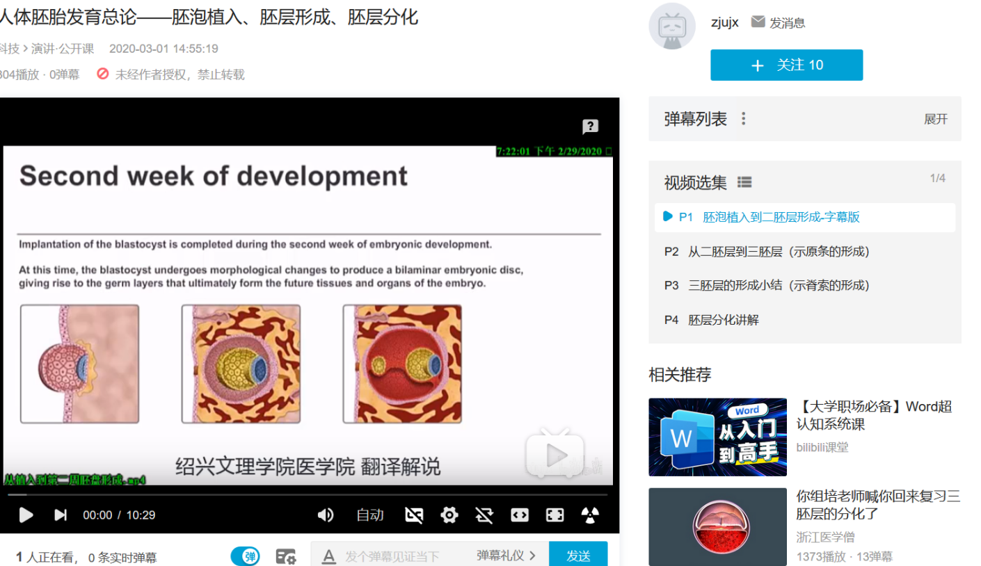 本章节学习内容的核心知识是“胚胎发育的动态演化过程”,唯有通过课后的思考和梳理,才能融会贯通应用于临床实践,初步构建起基础与临床之间的桥梁。围绕着这个核心知识,学生开展了三次课前-课中-课后的学习。其中教师总共录制微课6个,每个5-10分钟,该内容和形式得到了学生的肯定。学生反馈“我觉得这门课很好,录课的视频也喜欢看”;“相比其他网课视频,老师你的视频比较短而且很好,容易接受”。为了将来学生可以在超星学习通以外的平台观看,其中4个微课视频已上传到B站(哔哩哔哩网),截止3月16日,视频观看次数已达304次。