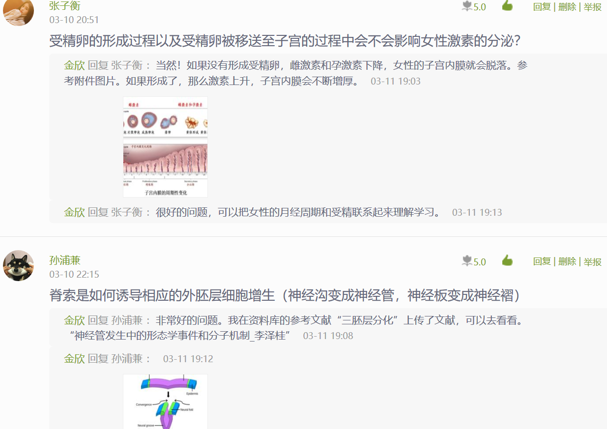 本课程的教学过程与大多数网课大同小异。以第3周的课——三胚层形成和分化这一节为例,课前推送课件和微课视频帮助学生提前熟悉适合自主学习的内容(图8);学生在讨论区留下自主学习过程中遗留的问题(图9)