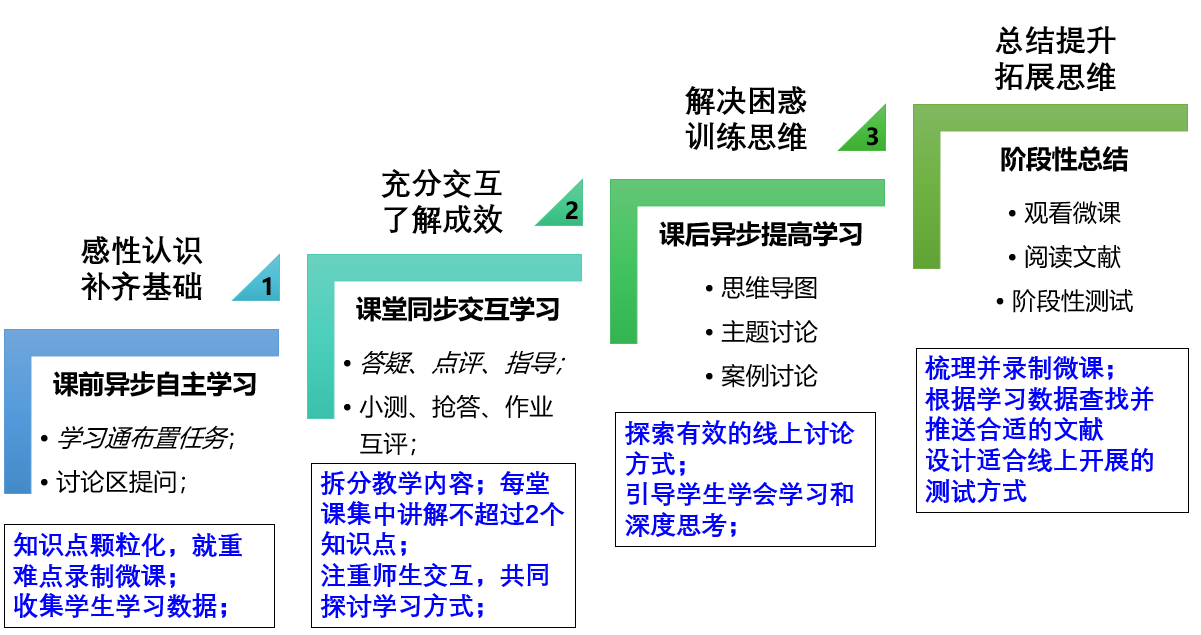 总结:这门课对于学生而言是略有基础、但仍有学习难点、同时需要充分的、交互的思维训练才能真正掌握。由此决定了网络授课时期异步开展的自主学习方式:(1)有基础,则没有必要再让他们花费大量时间在45min甚至更长时间的慕课视频上。(2)有难点,课前提供教材、课件、习题,以及可以反复观看的微课。而同步开展的学习则以师生交互式的答疑、讨论等形式为主。