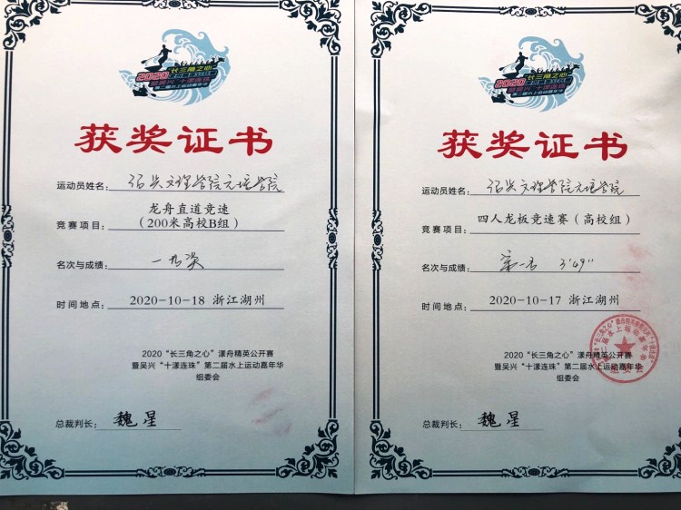 10月17日至18日,由湖州市体育局和湖州市吴兴区人民政府承办,国家体育局水上运动管理中心指导,浙江大学和湖州人民政府共同主办的“长三角之心”漾舟精英公开赛暨吴兴“十漾连珠”第二届水上运动嘉年华落下帷幕。我校元培学院龙舟队与浙江大学、复旦大学等十二所高校代表队同台竞技,以1分01秒和3分49秒的优异成绩勇夺名校组200米直道、四人龙板竞速赛两项团体冠军。队员宋林航与罗家豪两位同学分获皮划艇耐力冲城赛单人第四、第五名的佳绩。