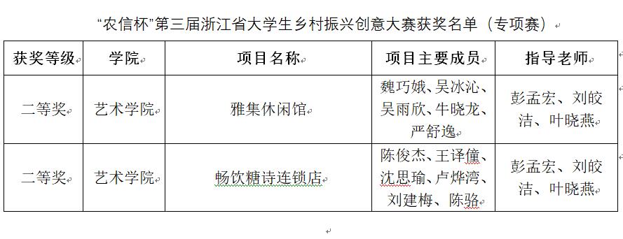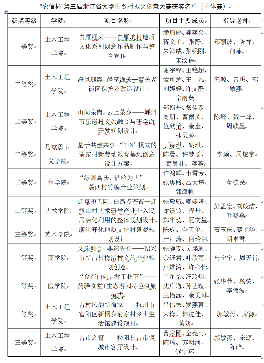 浙江省第三届“农信杯”大学生乡村振兴创意大赛决赛于11月8日举行,我校荣获主体赛金奖1项、银奖5项、铜奖5项,专项赛银奖2项。
