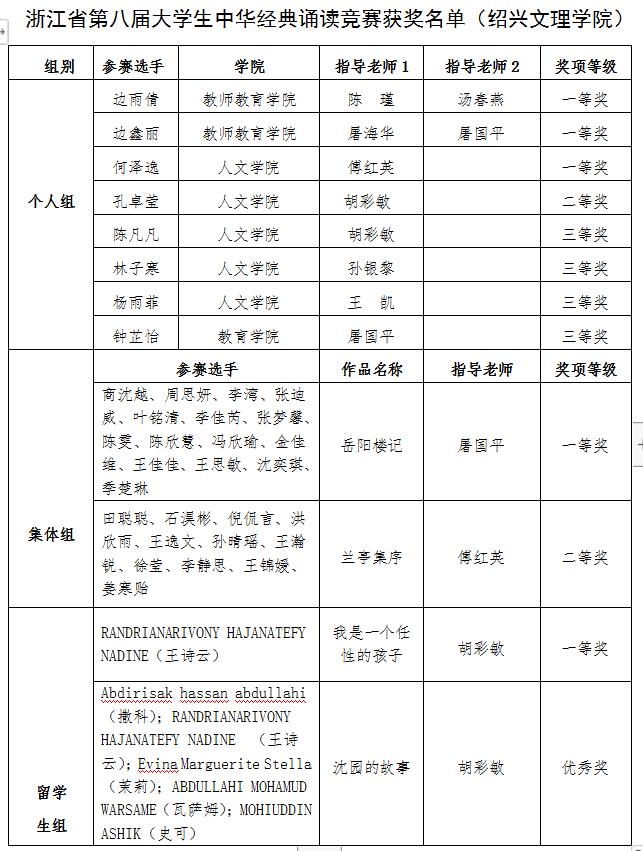 近日,浙江省大学生中华经典诵读竞赛组委会发文公布2020年浙江省第八届中华经典诵读竞赛获奖名单,我校学子再创佳绩。经过初赛和决赛,我校有8位学生参加个人组比赛,荣获个人组一等奖3项,二等奖1项,三等奖4项;两个组别参加集体组比赛,分获一等奖和二等奖;两个组别参加留学生组比赛,荣获一等奖1项、优秀奖1项,同时荣获优秀组织奖,获奖率100%。