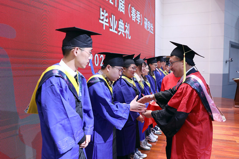 王建力为毕业生代表授予学位,颁发毕业证书。他代表学校对获得硕士学位的毕业生表示祝贺,向辛勤培育他们的导师和支持他们成长成才的亲友表示感谢。他对即将毕业离校的同学提出三点希望:一是牢记“修德”校训,厚植家国情怀;二是永葆“求真”精神,勇于开拓创新;三是秉持“卓越”理念,奋力成就梦想。