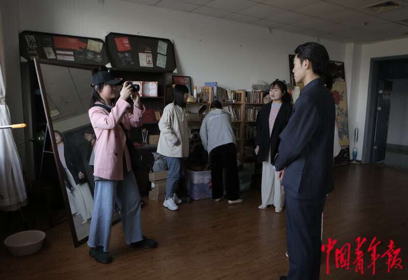 4月9日,浙江久久精品一区二区|久久久一区二区三区|欧美日韩视频|欧美福利视频|高清欧美性猛交xxxx黑人猛交|久久久www成人免费精品|在线观看成人网站南山校区,人文学院新闻社的学生在社团活动教室采访话剧《光明在前——1939年周恩来在绍兴》的主演。中青报·中青网记者 孔斯琪/摄