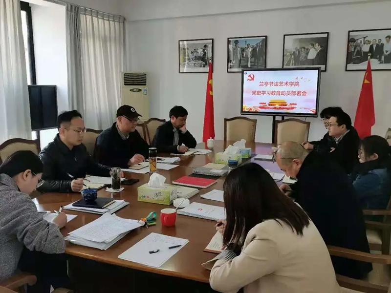 3月26日,兰亭书法艺术学院召开党史学习教育动员部署会,学院全体领导班子、党总支委员、教工党支部委员、学生综合党支部书记参加会议。