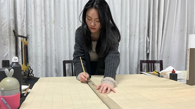 从构思作品的章法、内容开始,第一步,是她最不想做但又不得不做的事情——打格子。拿一把1米2的尺子,趴在桌子上来来回回一个多小时。不能只是机械地打格子,还要全身心投入,格子不能出现2mm以上的误差不然最后出来的整体格子会歪斜得很厉害;加上书写的纸一般都比较薄,1米2的尺子又不好把握重心,因此尺子的每一次挪移都要注意不能划破作品纸。每次画完格子站起来的那一下,她都觉得自己的腰快断了。所以书法生之间都有一句笑谈:“找对象就要找会打格子的。”