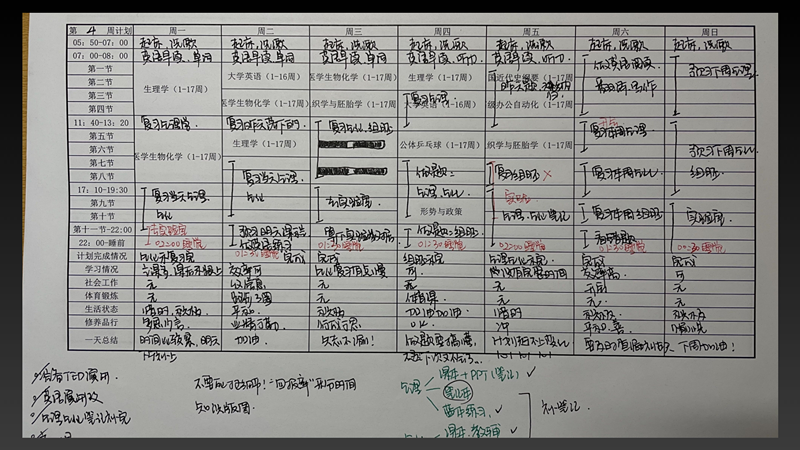 第二个数字是4.5小时。这4.5小时,不是别的,而是她每天的睡眠时间,不是持续1天,不是1个礼拜,也不是1个月,而是整整持续了1个学期。为了能在学习、科研、工作中找到更高效的平衡,她为自己制定了时间规划表,表上她细致地规划了每天每门课对应的课后复习时间,在保证学业的前提下,才把其他时间排留给科研与工作。早晨5:50早起,赶在8点上课前听英语新闻练习听力,背完英语单词,以积极的精气神迎接新的一天。中午的1个多小时午休,除去日常的开会,小憩一会儿,她便会复习上午课堂的内容。为了能把时间空出来,她努力提高学习效率,利用课间碎片化的时间学习,利用晚自习全神贯注地学习,直到管教学楼的工作人员来锁门,她再去实验室操作实验;而一个实验操作便是几小时,结束实验时往往已经是凌晨了。有时遇上期中或期末考试,结束实验后还要加班加点地背一本本厚厚的书。她能熬夜在班里是出了名的,班里的同学总是调侃她说,“朱明了是仙女,不用睡觉的,全靠一口仙气吊着”。说不累吗?当然累。但是她认为,这样的累,值得!学医的初心支撑着她坚持下去!往往最艰难的时候不是晚上一两点眼皮打架的时候,而是早上闹钟响起的时候,再坚定的信念有时也抵不过想要赖会儿床的冲动。她为了能督促自己起床,在床头放了一个很亮的灯,闹钟一响,她先把灯打开,刺眼的灯让她没有了睡意,她一遍遍在心里喊“朱明了!赶紧起床”,就是这样,她做到了每天早起。这个习惯她一直坚持到现在。不过,熬夜伤身,还是要劳逸结合。