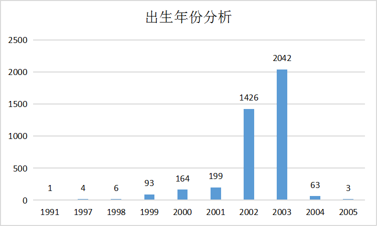 新生中2003年出生的孩子成为了主力军,共有2042位。年龄最大的是一位来自商学院的男生,出生于1991年09月,而另一位年龄最小的则是来自数理信息学院的男生,出生于2005年08月,年仅16岁哦!他们之间的岁数差竟然达到了14岁!