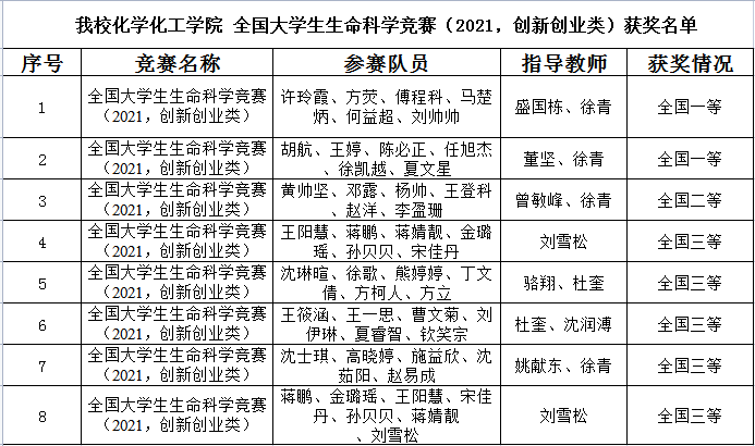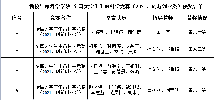 近日,第五届全国大学生生命科学竞赛落幕,我校生命科学学院、化学化工学院学子在比赛中获佳绩。在科学探索类赛道中,生命科学学院获得国家一等奖3项,二等奖2项,三等奖4项;在创新创业赛道中,学校获国家一等奖3项(化学化工学院2项,生命科学学院1项),二等奖2项(化学化工学院1项,生命科学学院1项),三等奖7项(化学化工学院5项,生命科学学院2项),获奖数量创历史新高。