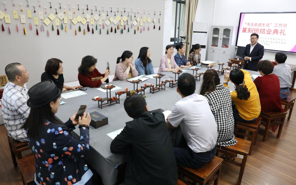 5月17日,中华优秀传统文化传承基地(书法)举办“书法走进生活”篆刻班结业仪式。校党委书记汪俊昌参加仪式并与结业学员亲切交流。兰亭书法艺术学院副院长,基地相关负责人,教师代表、研究生助教等参加活动。