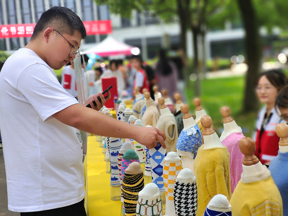 中午,志廉楼草坪旁边,一群身着汉服的女生正在现场展示刺绣技艺,她们正在展示的是《手工刺绣》课程的作业。现场还设置了刺绣DIY体验区,参与者可购买一个刺绣体验包,体验包的所得收入将全部捐入纺织服装学院爱心公益平台“壹诺公益”。此外还可以获得一张爱心券和壹诺基公益logo钥匙扣。