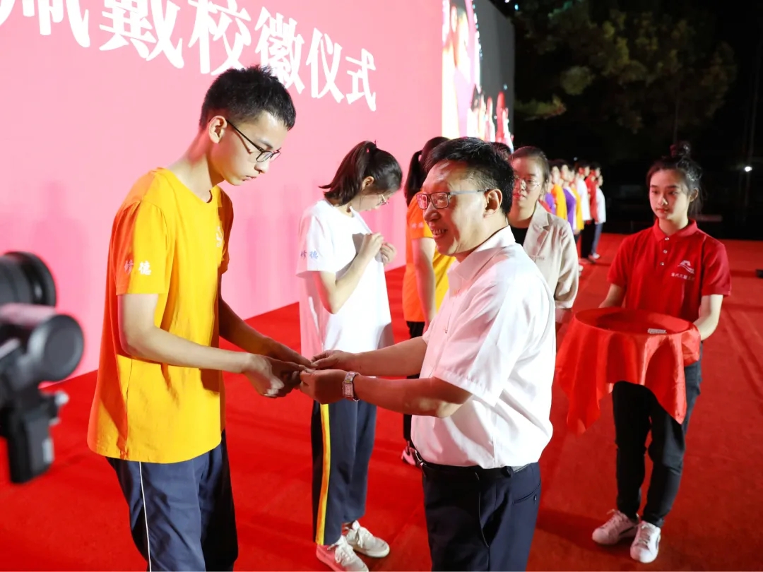 校党委书记汪俊昌为新生代表佩戴校徽。校长赵阳致辞,向新生的到来表示热烈欢迎。校党委副书记张宏主持开学典礼。