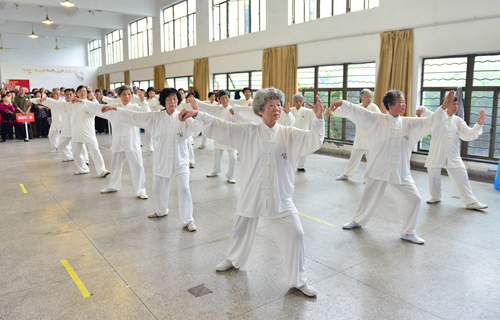 许学刚宣布运动会开幕。随后,在老教师们现场展示的女子集体太极扇子舞、个人独舞、太极拳集体表演后,比赛正式开始。