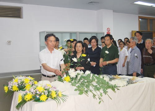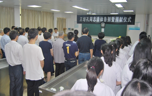 王继岗介绍了王培孔同志的生平事迹;王老的家属代表发表了感言;郑杰向王老的家属代表颁发了遗体捐献证书,全体人员手持菊花深深地三鞠躬,整个仪式简朴而庄重,实现了王老生前嘱咐过的愿望。