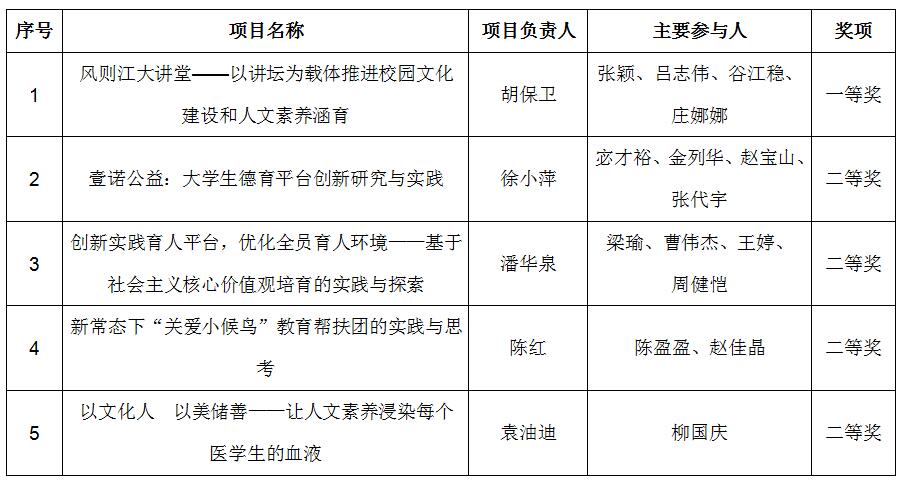根据《中共绍兴市委宣传部、绍兴市教育局关于评选2016年高校德育创新成果奖的通知》(绍市教〔2016〕34号)文件,经各在绍高校推荐、市委宣传部和市教育局组织专家组评审,由胡保卫老师负责的“风则江大讲堂——以讲坛为载体推进校园文化建设和人文素养涵育”获得一等奖;徐小萍老师负责的“壹诺公益:大学生德育平台创新研究与实践”等4个项目获二等奖。详情如下: