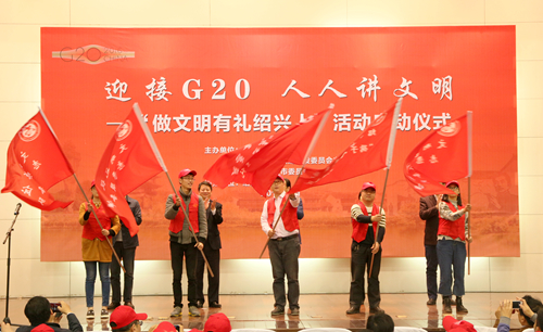启动仪式上,大家一同观看了杭州主会场活动电视直播。随后,绍兴分会场活动正式开始。省道德模范董国光宣读《做文明有礼绍兴人倡议书》,号召大家从身边做起,做到言谈举止文明有礼、公共场合文明有礼、邻里相处文明有礼、行路驾车文明有礼、旅游观光文明有礼、网上交流文明有礼,为“建设生态绍兴、共享品质生活”努力。何加顺部长、丁晓燕副市长、沈赤副书记等领导分别为社会各界代表分发《做文明有礼绍兴人》口袋书,并为文明交通志愿服务劝导队、文明礼仪志愿服务宣讲队、文明单位志愿服务队、“五水共治”志愿服务队、“点亮一盏灯”、“孺子牛”志工服务队等有关志愿服务队授旗。何加顺部长宣布“迎接G20 人人讲文明——做文明有礼绍兴人”活动正式启动,在场的“文明使者”响应号召,上路劝导不文明行为。