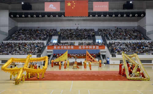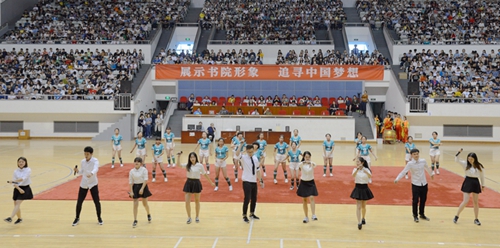 开幕式后,各书院学生代表为到场师生带来了一场异彩纷呈的文体表演,赢得观众台上阵阵热烈的掌声、喝彩声。竞雄书院学生深情演唱《大禹治水歌》,以深沉宏伟的声音撼动全场,之后带来武术《套路表演》,雄壮威武的音乐旋律,震撼人心的一招一式,将中国武术的内在美诠释的淋漓尽致。一枪,一剑,一刀,舞出文理人团结合作,自强不息的精神!“力争第一,是我们的目的……”伴着激情的音乐旋律,竞雄书院再次带来富有动感的群舞表演《我们必胜》。青春是个短暂的梦,由阳明书院、建功书院、仲申书院、文澜书院等带来的歌舞表演《青春修炼手册》,青春激荡,活力四射,感染了在场的每一位师生。舞文理之风采,展水乡之雄威,树人书院、成章书院、羲之书院、东山书院等带来的舞龙舞狮表演《龙腾狮跃》,其跳跃,其舞动,将同学们的目光紧紧抓住,细细品味,沉浸其中。竞雄书院选送的歌舞表演《阳光路上》作为压轴节目,以慷慨激昂的歌声,旋转动人的舞姿,为开幕式画上圆满的句号。