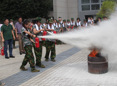 消防演练结束后,在消防官兵的指导下,同学们认真学习了灭火器的使用知识,并现场练习使用灭火器灭火。