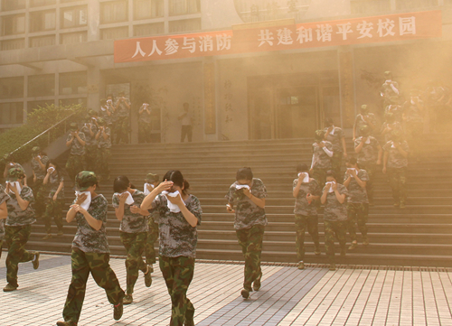 9月6日中午1点,南山阳明书院2号楼2楼楼道忽然浓烟滚滚,一名学生迅速向校园110报警,监控中心迅速拨打消防“119”、急救“120”。随着几声尖利急促的哨声响起,同学们纷纷以湿毛巾掩鼻,迅速而有序地从紧急出口向楼下疏散。几分钟的时间里,各楼层的学生陆续安全转移到楼下广场上。这时,2楼的1名女生挥舞着毛巾大声呼喊“救命”,消防官兵迅速架起消防梯,将受困女生安全救下,同时其他消防官兵连接好水带,扑灭火源。这是我校举行的消防安全宣传教育“进军训”疏散演练活动。