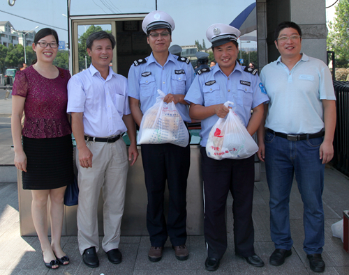华小洋副校长一行先后走访了招生办公室、河西校区南门门卫室、图书馆、河西医务室、河西学生公寓、河西餐厅、南山门卫室、元培学院异地新建指挥部等。每到一处,都与在岗教职员工一一握手并亲切交流,了解教职工们的工作情况,向他们表示亲切的慰问,并送上防暑用品。